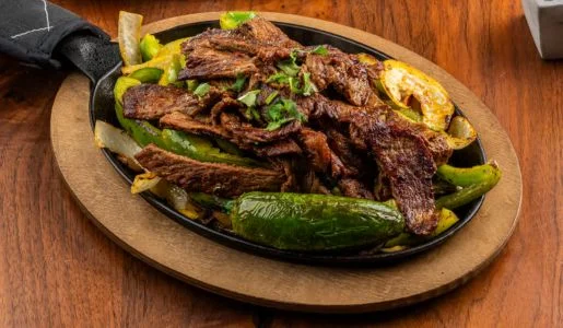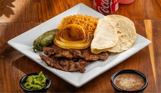 Beef, Chicken, green bell peppers, and onions. Served with rice, beans and tortillas.