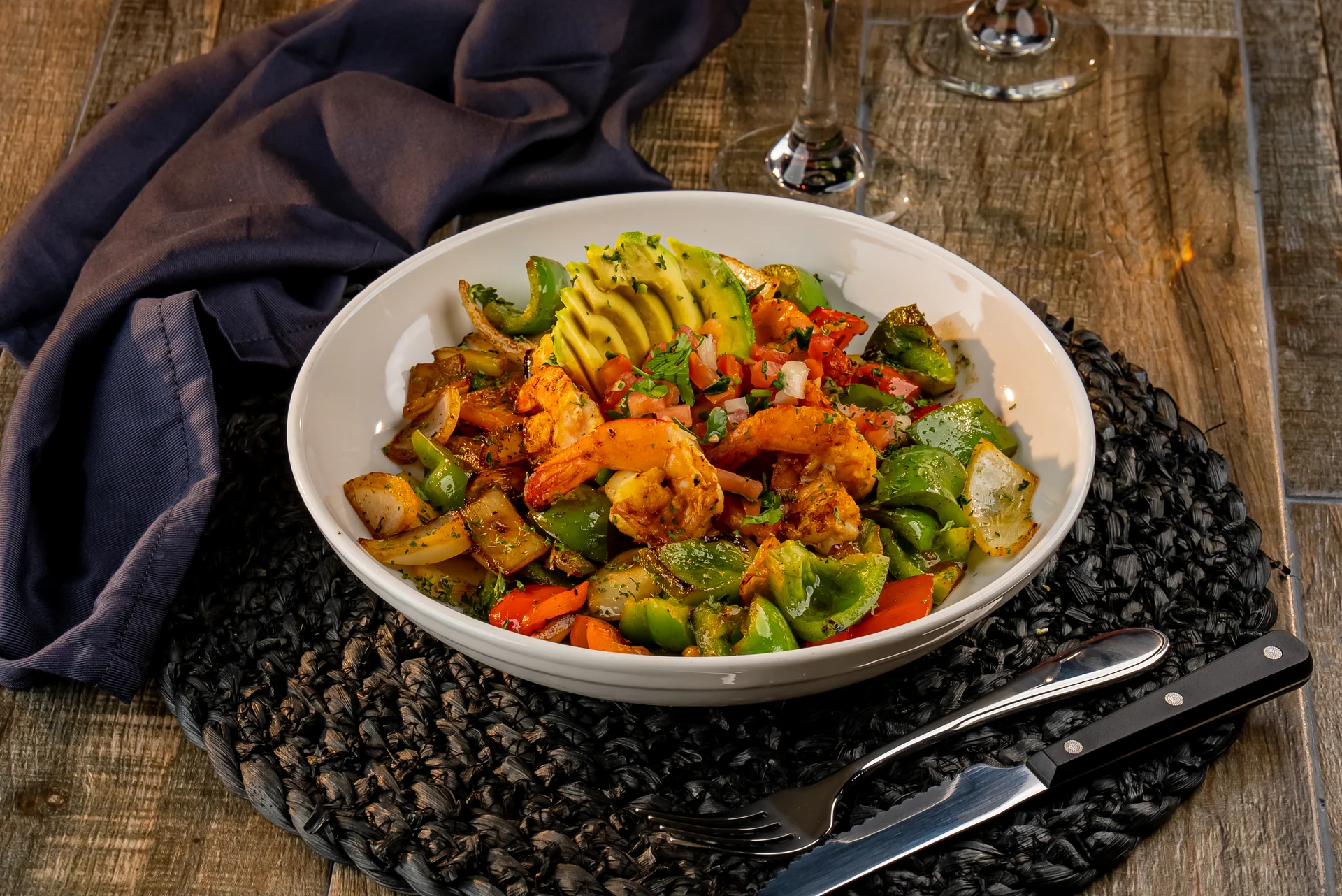 Shrimp, Grilled Veggies, Rice, Black Beans, Pico De Gallo And Guacamole.
