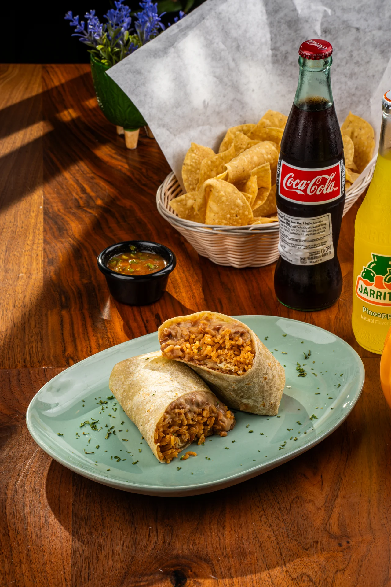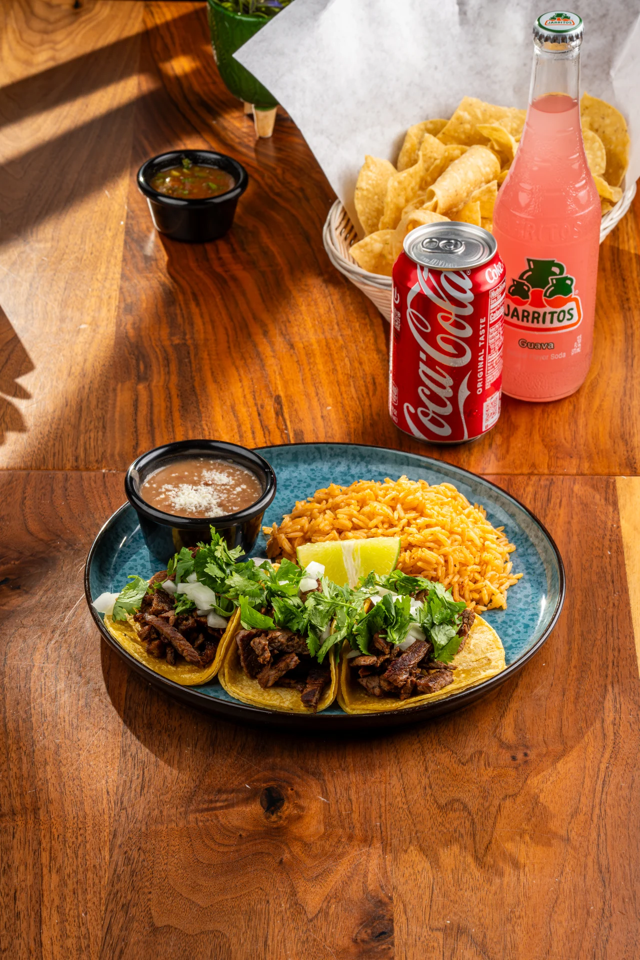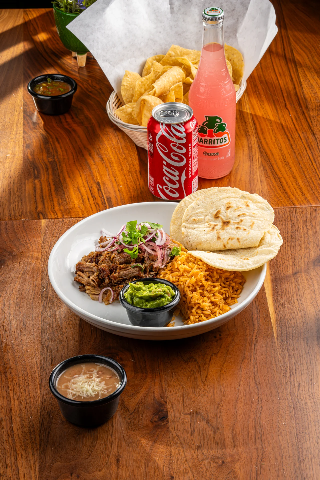 your choice of meat: Chicken, beef, pastor or carnitas.