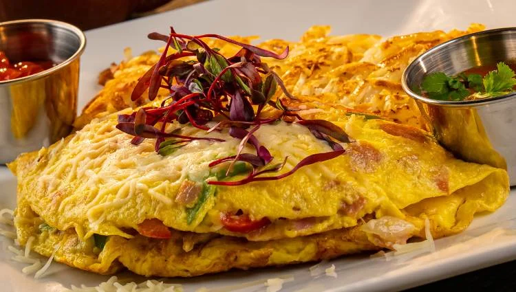 Ham, onions, bell peppers and cheese. Served with homemade breakfast potatoes and toast. Make it with only egg whites add $2.25