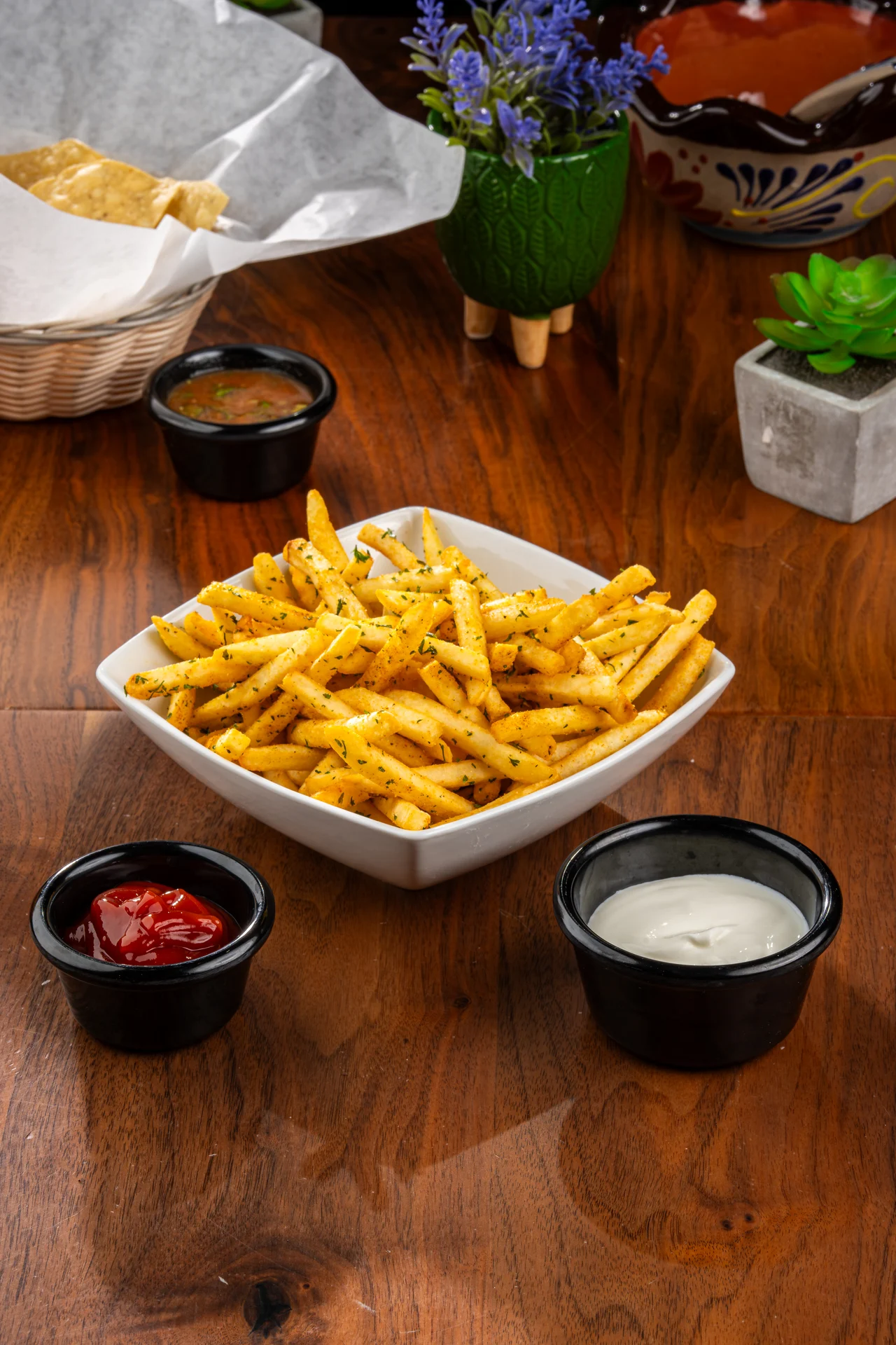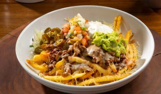 Your choice of meat: Asada, chicken, carnitas, or pastor. Served with beans, cheese, lettuce, tomatoes, onions, jalapeños, and avocado. Served with french fries.