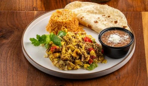 With chicken or steak, red or green with beans and two eggs any style. (No tortilla) Served with rice, beans.