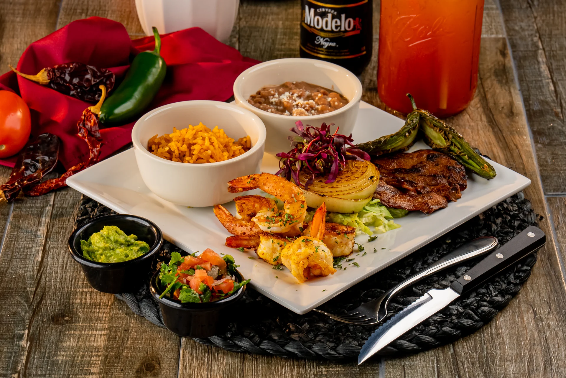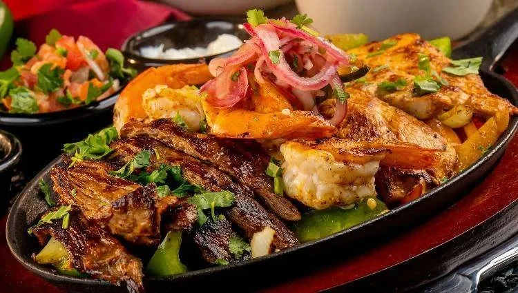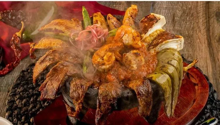 Marinated chicken, asada, 4 large shrimps, chorizo, nopales, mexican onion, jalapeño, cheese, rice, beans, and hand made tortillas