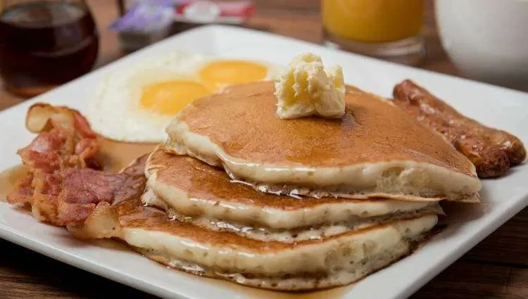 2 Eggs, 2 slices of bacon, 2 sausage links, and 2 pancakes.