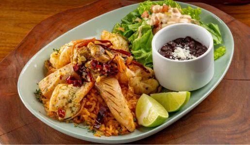 Chicken, steak, and shrimp. Served with rice, beans, and tortillas.