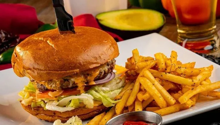 Served with beans, cheese, lettuce, tomatoes, onions, jalapeños, and guacamole. Served with french fries.