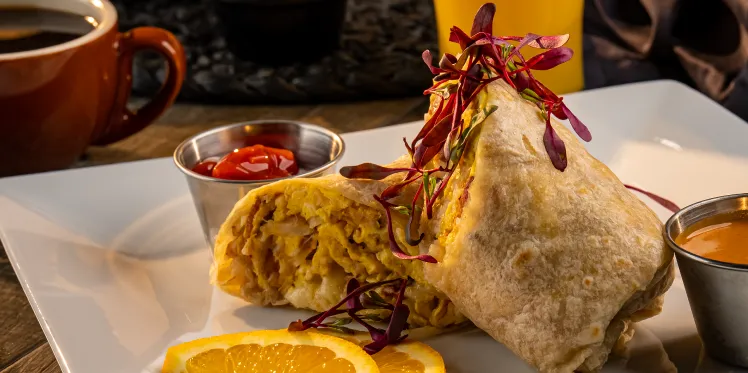 Choose one: Bacon, ham, sausage, chorizo or machaca (beef or chicken) all burritos served with home fries, 3 scrambled eggs, and cheese inside.