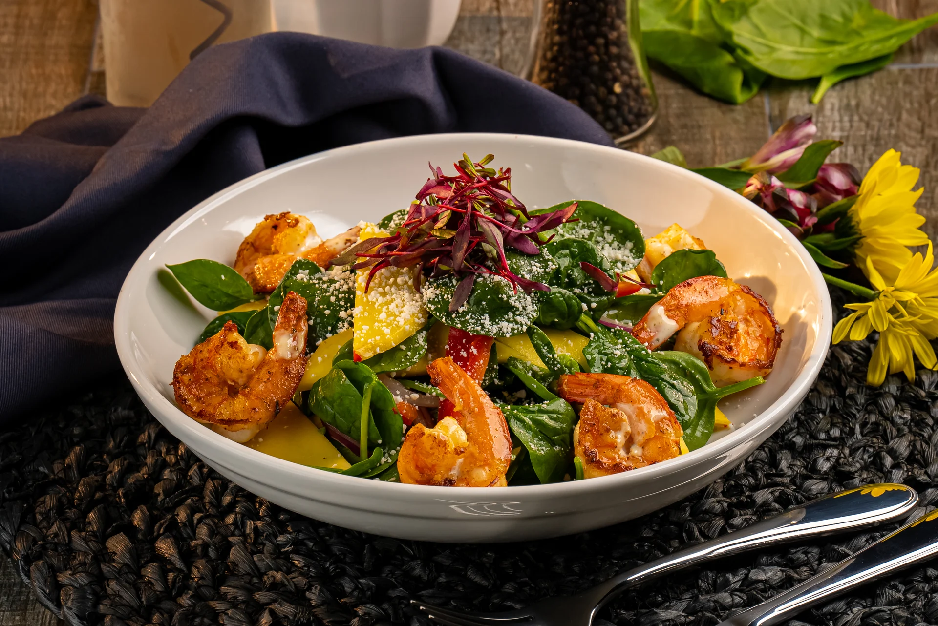 Chicken or steak. Fresh greens, arugula, tomato, red onion, avocado, mango, corn, cotija cheese.