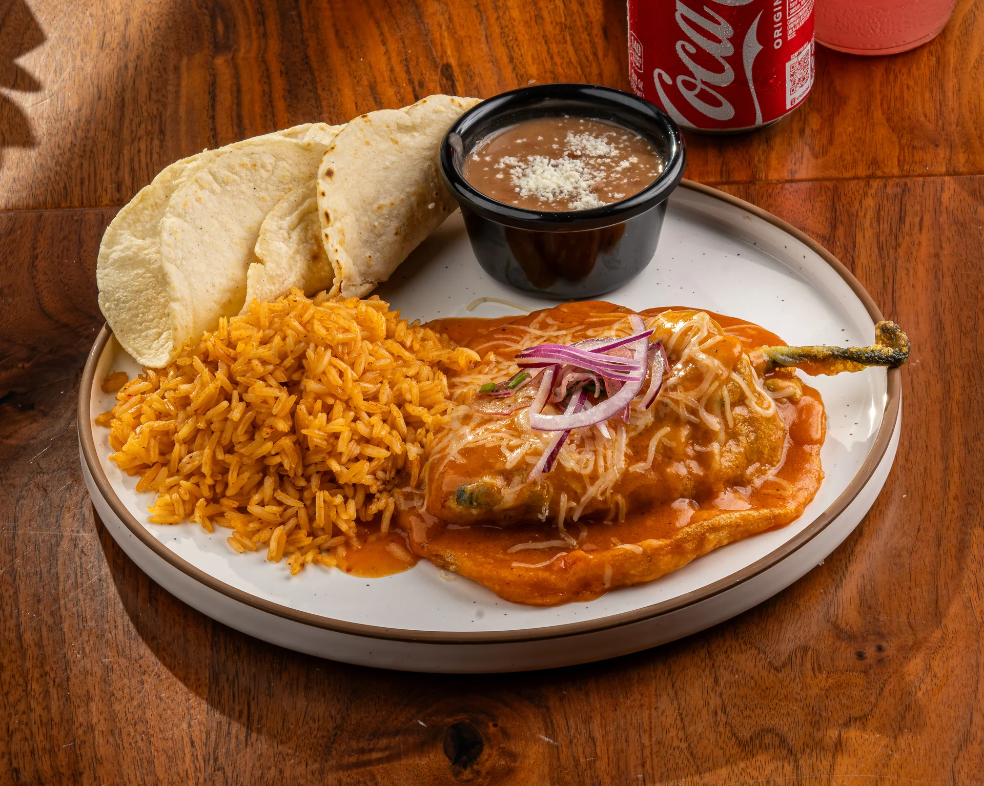 Served with rice, beans, and tortillas.