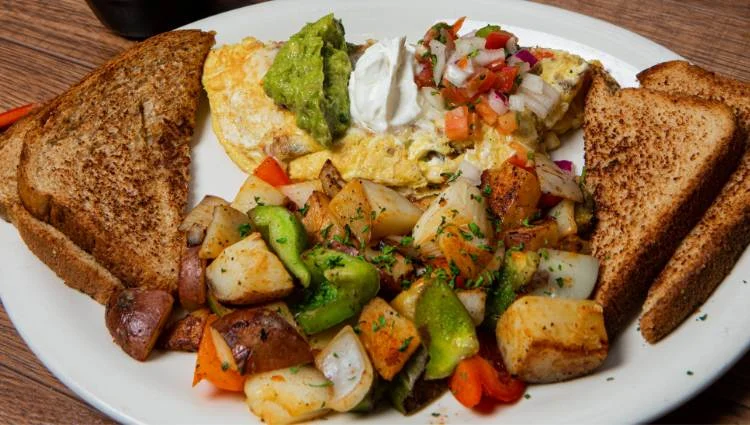 Avocado, bacon, and cheese. Served with homemade breakfast potatoes and toast. Make it with only egg whites add $2.25